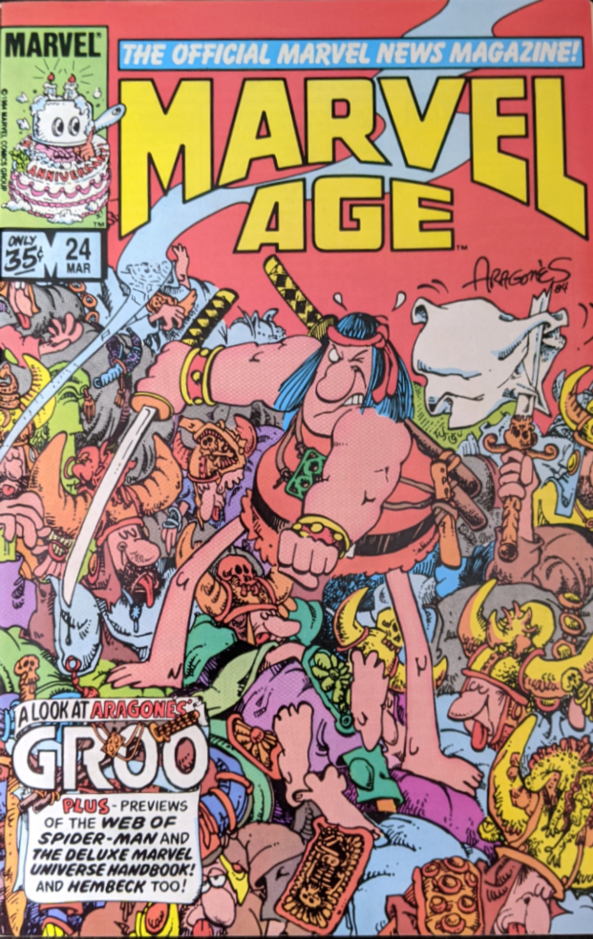I’m missing two of the covers but since I recently got all the issues I do have together I wanted to take a closer look at them. Issue 24, above, is the first time Groo was on the cover of Marvel Age. The article in the magazine talks about how Groo left Pacific Comics and came to Marvel with a bit of story preview of what Sergio And Mark Evanier have planned for the first couple of issues.