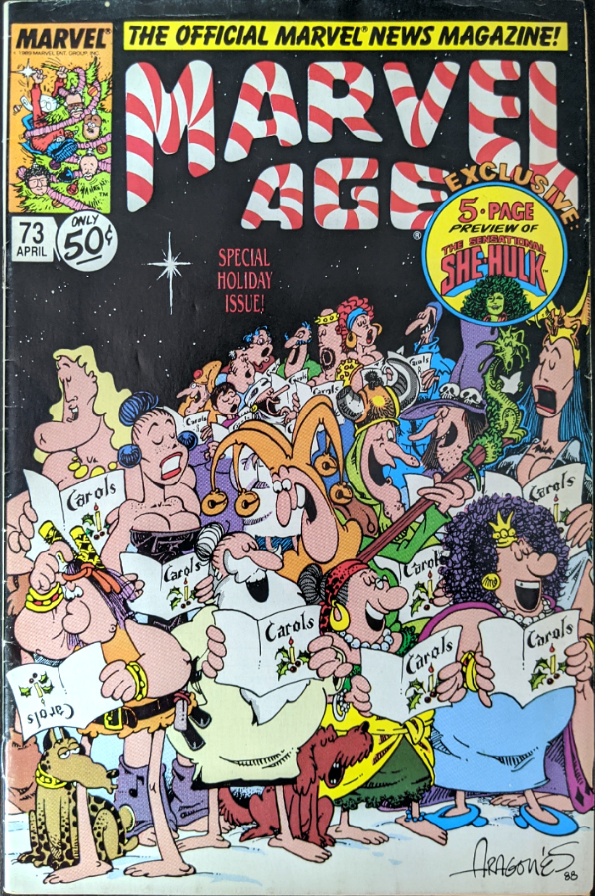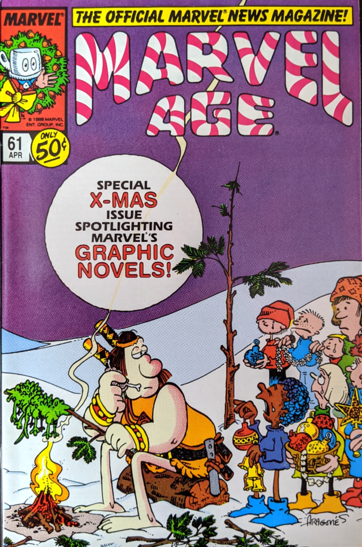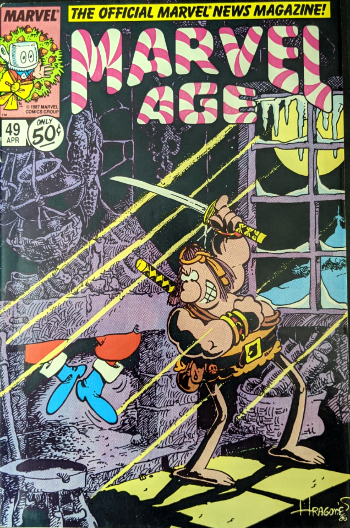 Groo was on the cover of Marvel Age seven times, and thanks to Mike’s Amazing World I’ve learned that those covers were all released right around Christmas. Issue 49 was released on January 6th, 1987, and issue 96 was released on November 20th, 1990, and all the rest were released in December. That explains why all of the issues except issue 24 are Christmas jokes, something I didn’t notice until I had all my issues together in one spot.