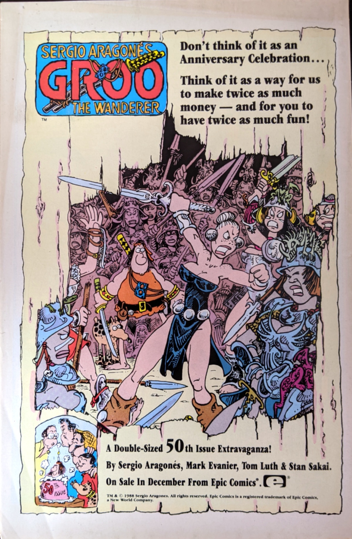 I’ll close with the house ad promoting the double-sized Groo the Wanderer #50 featured on the back cover of Marvel Age 73.