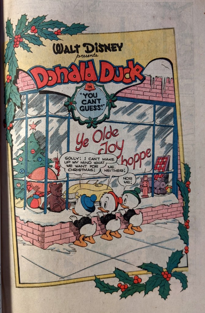 The story begins with Huey, Dewey, and Louie walking through a toy store realizing that they have all the toys they could possibly want. They decide to write a letter to Santa asking him to give their presents to other kids who don’t have so many toys. They put their letter in the mail and while walking home they see a store display with a metal building set (think Erector building toys). Suddenly they realize they don’t have a toy like this and change their mind about their letter to Santa. So much for altruism. They rush off to the mailbox only to see the mailman driving away with their letter. On the way home they decide to ask Uncle Donald for the building sets. They do just that and he makes a deal with them, if they can guess what he wants for Christmas he’ll get them the building sets.