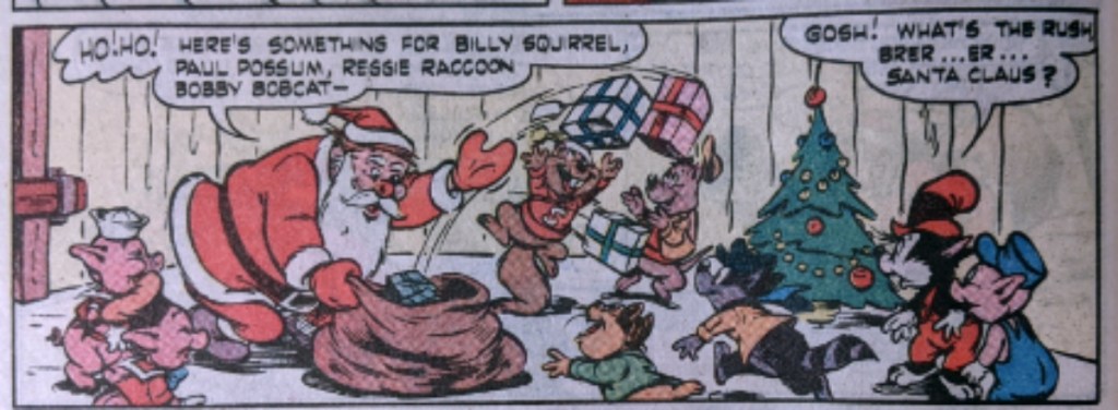 One of my guilty pleasures when it comes to Walt Disney Comics and Stories is Li’l Bad Wolf. I don’t know what it is about these stories but I simply enjoy the hijinks that Li’L Wolf, Zeke, and Br’er Bear get up to. I get a kick out of Li’l Bad Wolf doing good things and his dad Zeke getting frustrated with him. This story features Li’l Bad Wolf and Br’er Bear giving out Christmas gifts at Li’l’s club. Zeke is annoyed that Li’l spent his money on gifts for other people instead of turkey dinner for themselves. Zeke heads off mad to Brer Bear’s place and see’s all the turkey’s he’s got. Br’er Bear has to go deliver the gifts, dressed up as Santa Claus, but is worried that Zeke is gonna steal a turkey. After he gives out all the gifts he rushes back and finds a turkey missing and storms off to pound Zeke. Zeke didn’t take the turkey though Br’er Fox did.