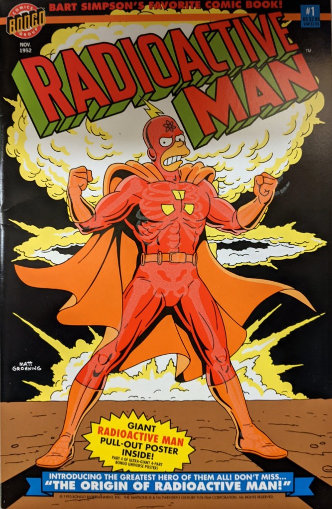 Is Radioactive Man #1 one of the most meta comics ever published? In May 1991, The Simpsons, “Three Men and a Comic Book”, aired. In the classic episode Bart, Milhouse, and Martin pool their money to buy a copy of Radioactive Man #1 to share between the three of them. Eventually their own greed gets the better of them and the comic book is destroyed in a storm as they fight over it. In January of 1993 Bongo comics published a real life version of Radioactive Man #1.