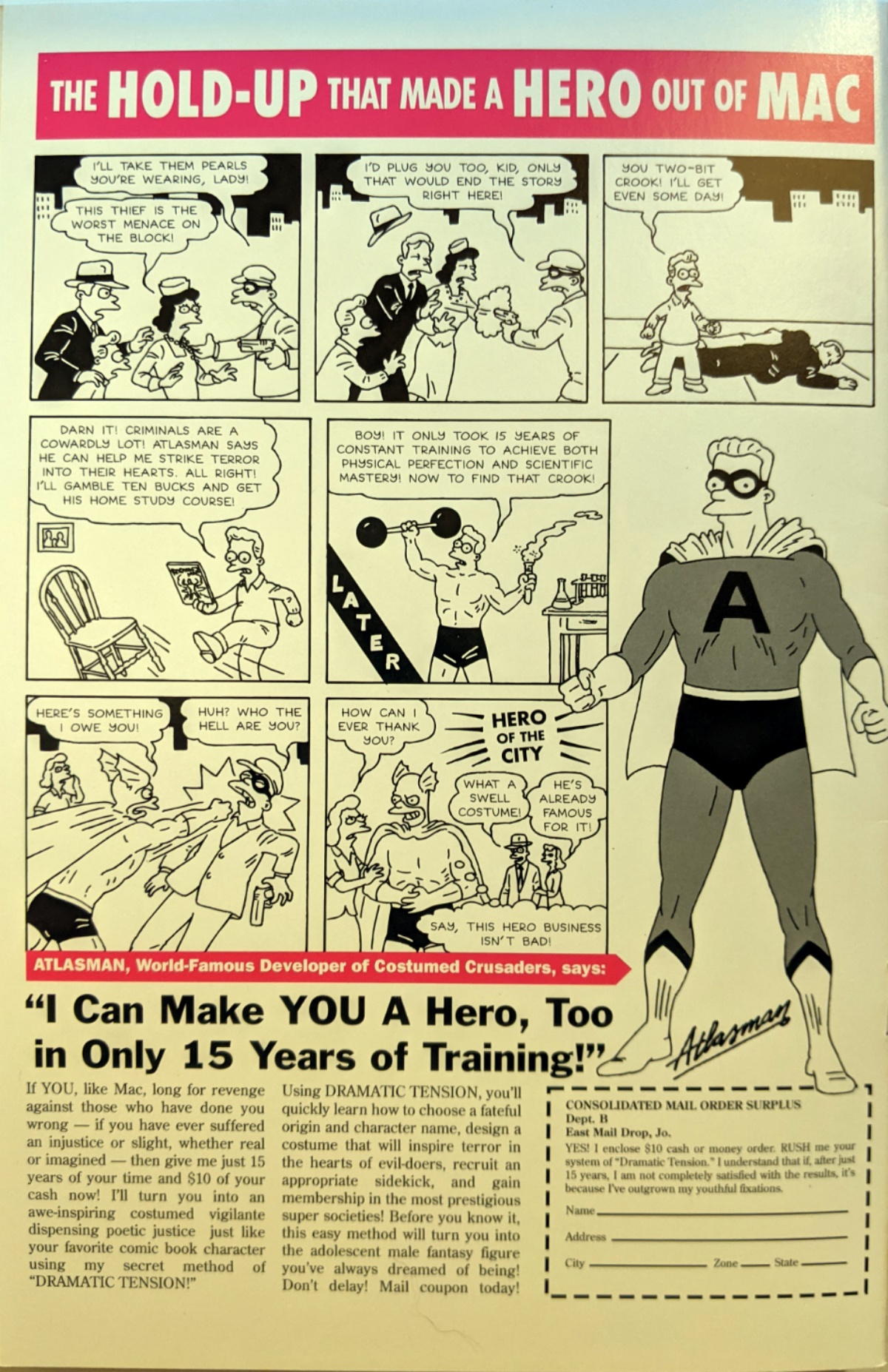 The story itself is a throwback to early superhero origin stories, mashing up bits of the Incredible Hulk and Superman along with other common tropes. One of the most clever bits is the fake advertisement on the back cover which looks like one of the old Atlas ads that promised to turn a wimp into a jock. This ad instead promises to turn a kid into a superhero. The comic strip features a child whose parents are killed, just like Bruce Wayne’s, and he vows revenge by buying Atlasman’s home study course.