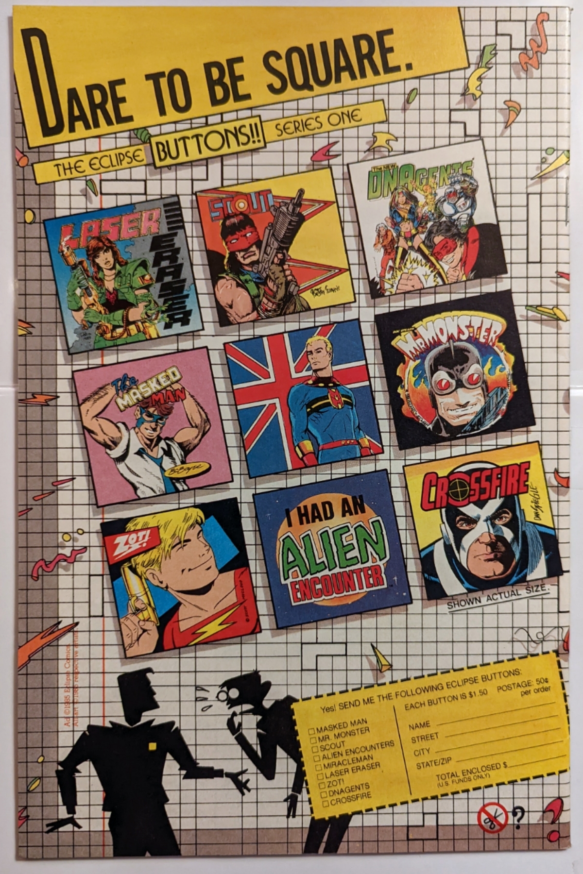 What’s really amazing about the ad though is how quintessentially eighties it is. The black and white grid with 3-d color squiggles looks like it came right out of an A-Ha video. The askew, shadowed images really pop off the page. Comic buttons and pins were popular at the time, they were a nice small item a comic shop could keep on the counter at the register as an impulse buy. I can attest to the fact that they were popular because I had quite a few. They were on my jacket, my book bag, and for a little while my baseball caps.